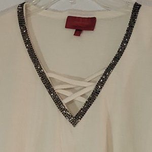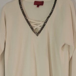 WOMENS JENNIFER LOPEZ IVORY LONG SLEEVE V NECK SWEATER WITH SILVER & BLACK COLLAR, J-;LO APPROVED, NICE LIGHT SWEATER THAT WILL MAKE YOU FEEL LIKE A MOVIE STAR....