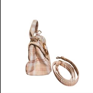 SUPER CUTE AND NEUTRAL COLORS TO GO WITH EVERYTHING. CAN BE WORN AS A CROSSBODY PURSE OR HAND HELD. PLAID HANDBAG HAS A FLAP CLOSURE WITH A DISTINCTIVE AMBER-COLORED, CIRCULAR BUCKLE