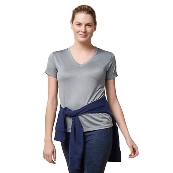 Features: V-neckline, dropped hem, rolled-cuff short sleeves, New Balance dry technology
