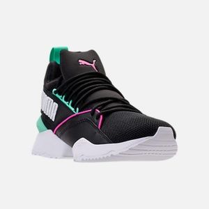 Black/Knockout Pink/Biscay Green.Chic satin upper with mesh and synthetic accents.Metallic accents for boosted style.Ultra-flexible, chunky midsole for big style and comfort.Plush foam cushioning.Eye-catching Puma branding.The Puma Muse Maia Varsity is imported.A sleek, sophisticated take on the Puma Muse silhouette, the Women's Puma Muse Maia Varsity Casual Shoes marries fashion and function for a stylish everyday look.I custom order these for customers so if your interested in placing an order