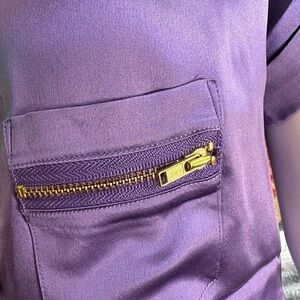 With a left breast pocket adorned with a gold zipper embellishment, this beautiful top is a true statement piece. In impeccable condition, it is a must-have for any fashion connoisseur. Elevate your style and embrace luxury with the Diane Von Furstenberg Ray purple silk scoop neck top.