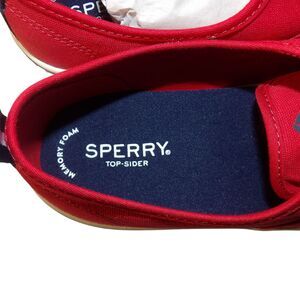Elevate your shoe game with these stylish and comfortable red Sherry Top Sider Memory Foam sneakers by Sperry. Featuring an almond toe shape, lace-up closure, and flat heel style, these sneakers are perfect for any occasion, whether it be travel, casual wear, or workwear. The synthetic upper material and canvas lining material provide durability and comfort, while the memory foam insole material offers added support. These sneakers are part of the Top Sider product line and are a classic addition to any shoe collection. With a solid pattern and logo accents, they are a versatile choice for any casual outfit. Whether you're hitting the beach, going fishing, or just running errands, these sneakers are the perfect choice. Has 3 Pair New S-3