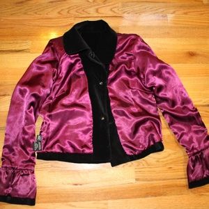 GORGEOUS JACKET SOFT BLACK VELVETY MATERIAL, PEPLUM SLEEVES AND BACK WITH A PETER PAN COLLAR. THE JACKET HAS A THREE BUTTON CLOSURE & INCLUDES TWO SIDE POCKETS ON EACH SIDE.