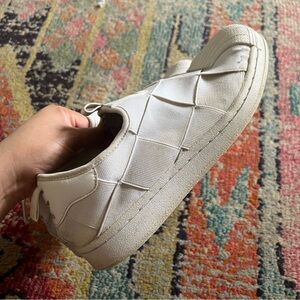 Stylish white slip-on sneakers with a unique design. Features a comfortable sole and easy pull-on tab.they are in fair condition since they have some stains as seen in pictures
