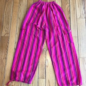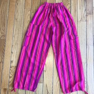 These are women's pink, purple, and red striped lounge pants in Size LARGE (L). The pants are made in Peru and are 100% cotton.