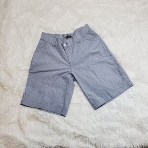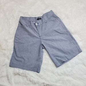 Seersucker bermuda shorts in blue and white. Center zipper with button fly.