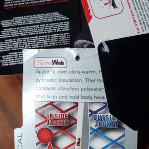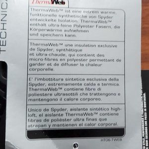 ThermaWeb fabric - Spyder's own ultra-warm, high-loft synthetic insulation. ThermaWeb TM contains ultra-fine polyester fibers that trap and hold body heat.