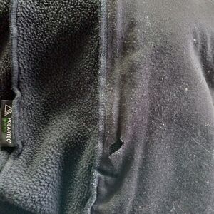 It's a black, Fleece, soft shell jacket. It's has signs of wear, holes on the inside of the pockets as seen in pictures but no holes in the outside. It's in good pre-owned condition Size Small