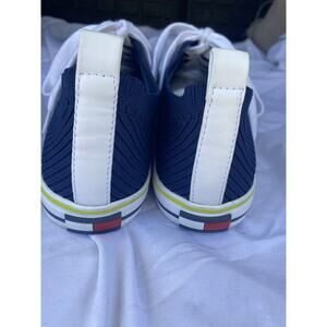 The product is a pair of women's Tommy Hilfiger athletic sneakers in size 9.5M. These sneakers feature a ribbed knit textile construction with a colorblock pattern in red, white, and navy. They have a low top design with a comfortable cushioned insole made of synthetic material. The shoes are breathable, stretchy, and suitable for various activities such as walking, tennis, and sports. The Tommy Hilfiger logo accents and patriotic theme make them a stylish and classic choice for casual or activewear occasions.