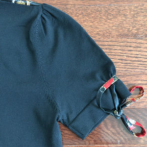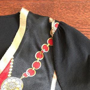 Chic women’s top. Black, gold and red patterned front and black knitted back. V-neck framed with gold color faux leather. Short sleeves with ribbon ties. Slits on both sides.