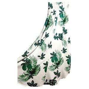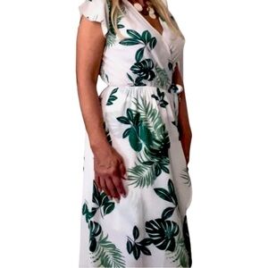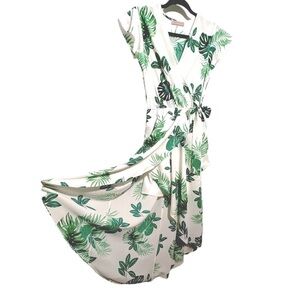 Women's White & Green Tropical Floral Print Flutter Sleeves V Neck Hi Low Asymmetrical Hem Side Tie Cinched Waist Size Small