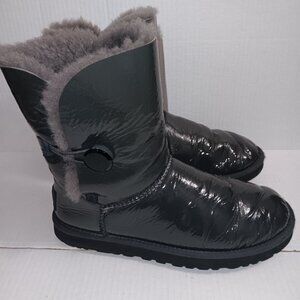 Size 9 Women's Ugg Bailey Button Mirage Boots has side button closure and a shiny patent leather like finish in the color gray in good pre-owned condition Note some creasing on boots as seen in photos, soles are in excellent condition. Limited Edition these boots are no longer available from Ugg website