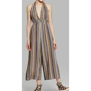 WOMENS WILD FABLE DEEP-V HALTER TOP MULTICOLOR STRIPED CROPPED LEG JUMPER
