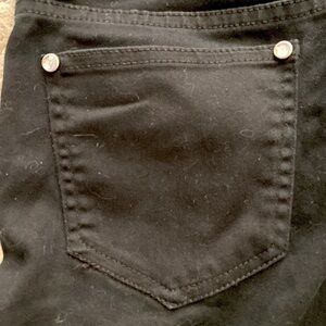 Women’s black Bermuda style shorts with crystal clear buttons on front and corner of each pocket