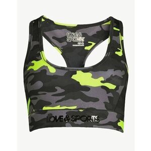 Material: 77% Polyester/23% Spandex • Care: Machine washable • Country of Origin: Imported • Size: Model is 5’11” and is wearing a size S • Type of Cups: Removable inner cups • Coverage: Full • Support Level: Medium • Straps: Tank straps; racer back • Features: Moisture-wicking material helps keep you cool and dry; lined bottom band for added comfort; shiny logo on bottom band; tag-less back; allover camo pattern • Peel. Stick. Love. Our hang tags are also fun stickers! • Camo Sports Bra for Women from Love & Sports Love & Sports. Fitness, meet fashion. Introducing high-performance activewear, swim & accessories as bright & bold as the people who rock it.