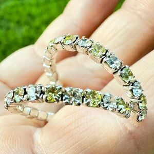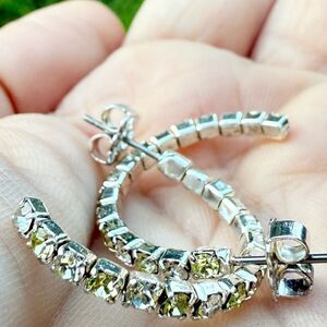 Chic pair of silver hoop earrings designed with a tennis-style crystal setting. Each hoop is encrusted with alternating yellow and clear stones, creating a playful yet sophisticated shimmer that catches the light from every angle.