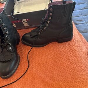 Black leather, lace-up, BRAND NEW, ARIAT brand, sz 7.5, steel toe, great for practice in the ring or anywhere you are around large animals. FREE shipping domestically