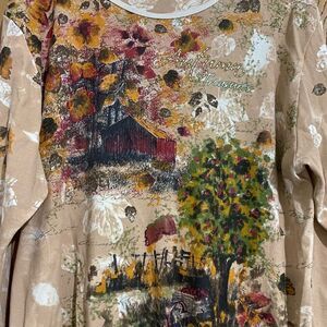 Morning Sun WOMEN’s MULTICOLOR AUTUMN TREASURES- NATURE PAINTING AUTUMN/FALL LANDSCAPE INSPIRED PRINT 3/4 SLEEVE SHIRT Sz-2X