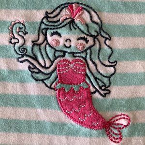 Adorable embroidered mermaid on the front in light pink, dark pink, white, and black.