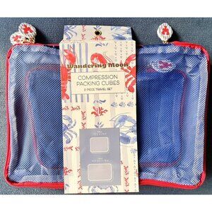 Made by the brand WONDERING MOON, this set includes two separate packing cubes feature a a blue and red design with lobster accents, adding a fun and vibrant touch to your travel ensemble.