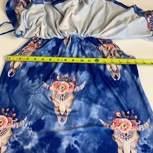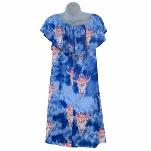 WONDERLAND by ORANGE Off-The-Shoulder Flounce Rodeo Dress Cow Skull on Blue Sz S