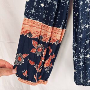 WONDERLY Top L Navy Blue Rust Floral Button Front Long Sleeve Woven Rayon
