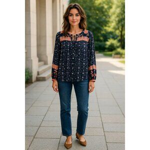 Here is a beautiful navy blue rust floral top from WONDERLY. This blouse features a tasseled keyhole neckline and long balloon sleeves adding a touch of bohemian elegance to your outfit. The button-front design and long sleeves make it perfect for any occasion, whether it's casual, work or church. The top is made of breathable woven rayon, perfect for all seasons. This tunic length blouse has a loose fit. Women's size large. Very gently preowned - Like new!