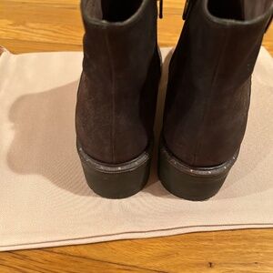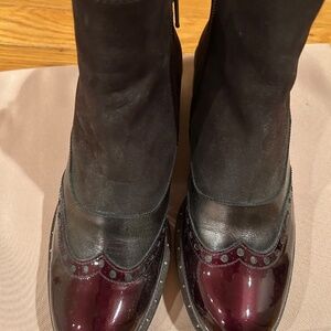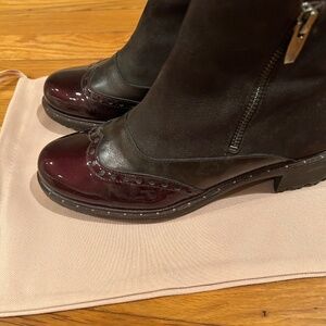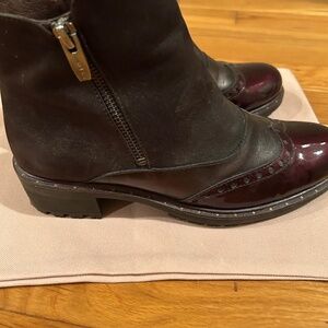 Brown leather boot, burgundy front area, easy to zip up, zippers on inside and outside