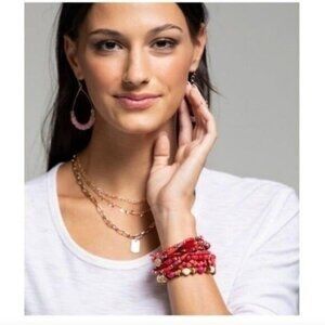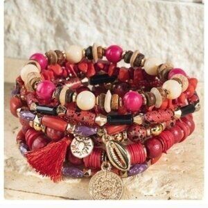 WOOD, GLASS, ACRYLIC & METAL MULTI-BEADS -LAYERED STRETCH BRACELET-NEW