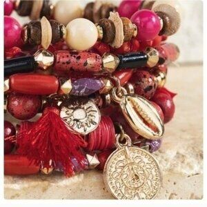 WOOD, GLASS, ACRYLIC & METAL MULTI-BEADS WITH TASSEL ON MULTI-LAYERED STRETCH BRACELET.