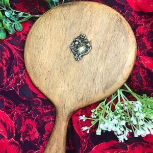 WOOD HANDHELD MIRROR 1920s ANTIQUE WITH LADY CAMEO MEDALLION & BEVELED GLASS