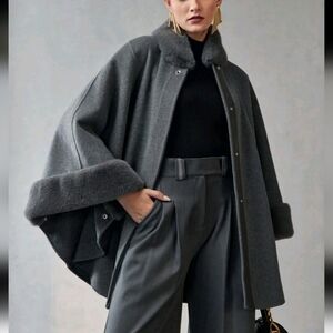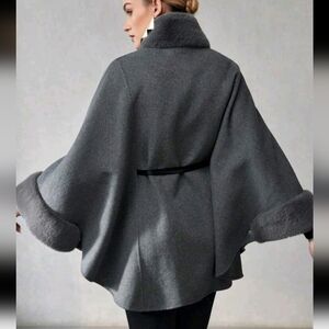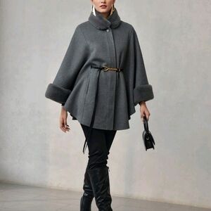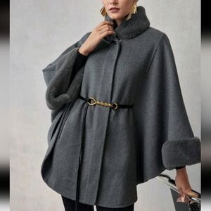 WOOL CONTRAST FLUFFY CHAIN BELTED CAPE OVERCOAT