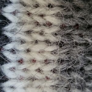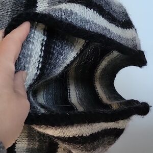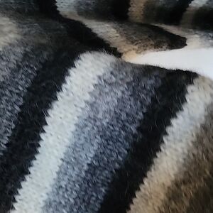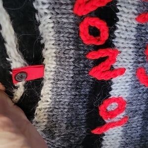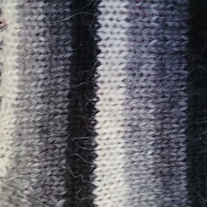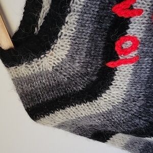 Feels like very high-quality wool with Mohair. Black, gray, white stripes with red embroidery " io non so voi"