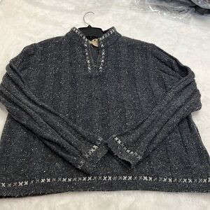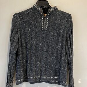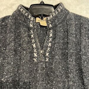 Woolrich quarter zip sweater. Color is called onyx Heather. It’s variation of grays. Medium weight sweater, blend of wool, raime, acrylic and nylon. Good quality sweater made to last. Has some piling otherwise no known issues.
