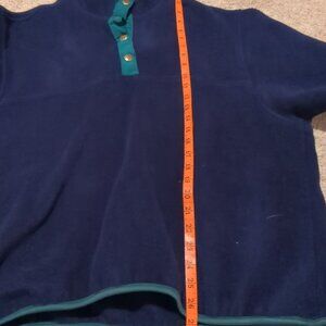 This is a vintage Woolrich jacket for men in size XL. It features a solid blue and green color pattern, with a mid-length and 1/4 snap pullover closure. The jacket is made of polyester outer shell and fleece lining, suitable for casual wear in winter, fall, and spring. It has a stand-up collar and a USA theme, with a regular fit and a classic design.