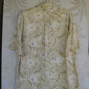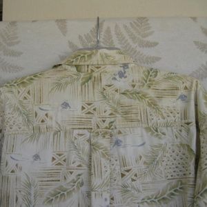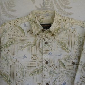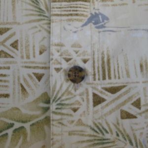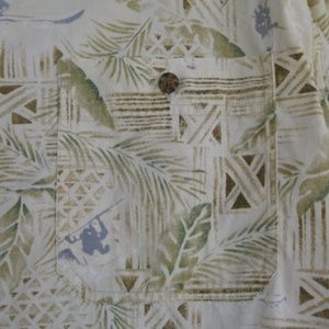 This Woolrich casual button-down has an interesting tropical print and is made of 100% Cotton. It has a button pocket on the left chest area. Label Is missing (removed). True size measurements are; Pit to Pit across back: 26 in. / Collar to Tail Down back: 32 in. / Neck: 17 in. This shirt is really cool and in Excellent Used Condition. Won't last long. Make me an OFFER !!!