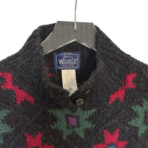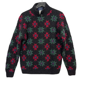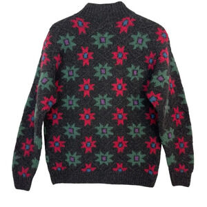 Vintage, Woolrich, wool sweater, cozy, rustic, retro, 1980s, 1990s, geometric pattern, star motifs, bold colors, charcoal background, folk-inspired, Southwestern style, Nordic design, high collar, button closure