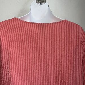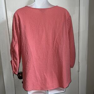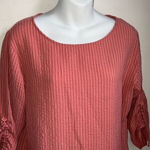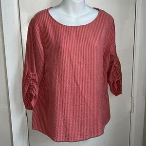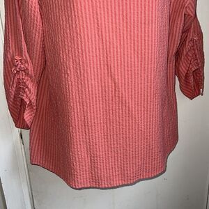 Machine washable rayon, polyester, spandex blend for a seersucker feel in a geranium stripe pattern with cinched 3/4 sleeves. Excellent condition. Size small, measures 21” from armpit to armpit and 24” from top of shoulder to bottom hem.