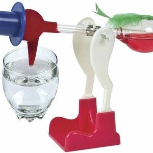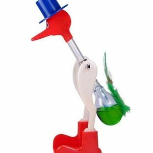 A rather silly looking 6" bird with a felt covered head and has plastic feet. Worse, he cannot get his fill of water. You buy the drinks.. Fluid inside condenses from the evaporative cooling of the water off the bird's beak, making it top heavy and dunking it back into the water. The condensate rejoins the liquid pool in the bird's bulb, and he tips up again..