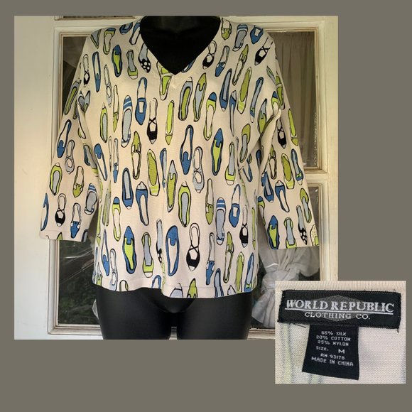Selling a World Republic 3/4 sleeve light-weight sweater with a cute shoe printed design, size M.