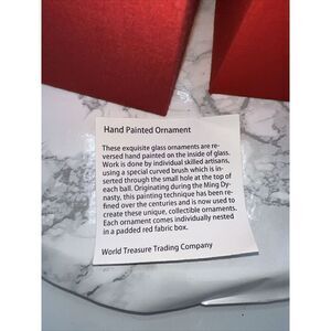 Lot of 4 includes 4 reverse painted handmade glass ornaments. Each has a red string hanger, includes Bluejay design, butterfly design, crane design, and Koi fish design. Each comes with a padded red box. Approximate measurements are.