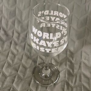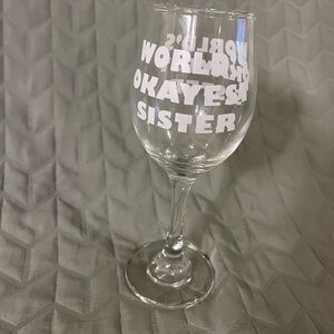 “WORLD’S OKAYEST SISTER” 11 oz Wine Glass by Funny Guy Mugs Novelty Gift. New without tags. Never used, just stored in the cupboard. Made with extra thick glass to prevent breakage. Printed professionally. Dishwasher safe.