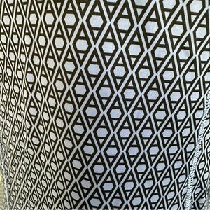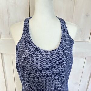 Purple and black geometric pattern. Side zip pocket. Keyhole back with hook closure. Built-in sports bra with removable pads.