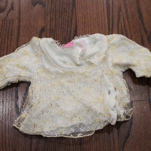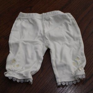 Two piece long sleeved top and pants outfit in white and yellow. Top is white shirt with sheer lace overlay with flower pattern, pants are white with lace trim on legs with yellow flowers. Worn once. Wrinkles due to storage. From Baby Grand. Size 3-6 months. Smoke/pet/allergen-free.