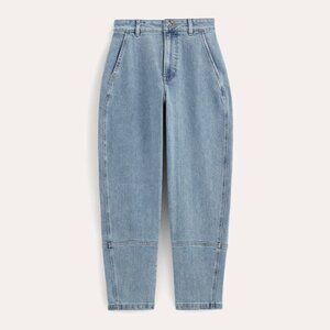 The shape of things to come. Made of regenerative cotton denim with just a touch of stretch the Utility Barrel Jean is complete with a waist-nipping high rise a cool curved leg and an easy cropped length. Plus it has utilitarian details like accent stitching and patch pockets for a craftsman-inspired look. Everlane Women's Utility Barrel Pant in Light Indigo, Size 30
