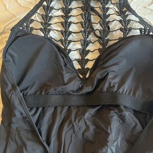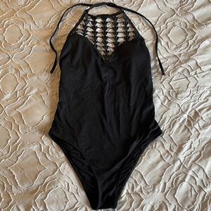 WORN ONCE, no signs of wear. From Forever 21. One piece bathing suit with crochet designed top piece. Built-in & removable support/padding. Color is black. Size is medium (had to cut tag out). Paid $18.