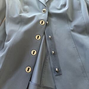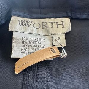 Worth Collection black techno fabric pantsuit size 6. Beautiful hardware. The jacket is 30 inches in length and the bust is 30 inches and the sleeves are 24 inches. The length is 43 inches, the waist is 30 inches, the rise is 11 inches inches, and the hips measure 38 inches.