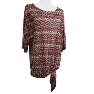 This Worthington top is perfect for adding a touch of artsy flair to your career or casual wardrobe. The brown tones and chevron zig zag pattern create a visually interesting and neutral design that is easy to pair with other pieces. It's a size large.