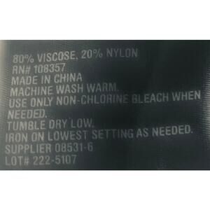 80% Viscose, 20% Nylon; Recommended on Tag: Machine wash warm, tumble dry low Made in China