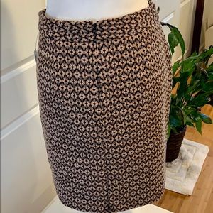 Khaki and black patterned skirt is a polyester, cotton, and spandex blend. Measures approximately 19.5” long, waist is 16.5” laying flat, 2” wide waistband. Has a solid black polyester lining. Fabric feels really nice and substantial with a good amount of stretch. NWT